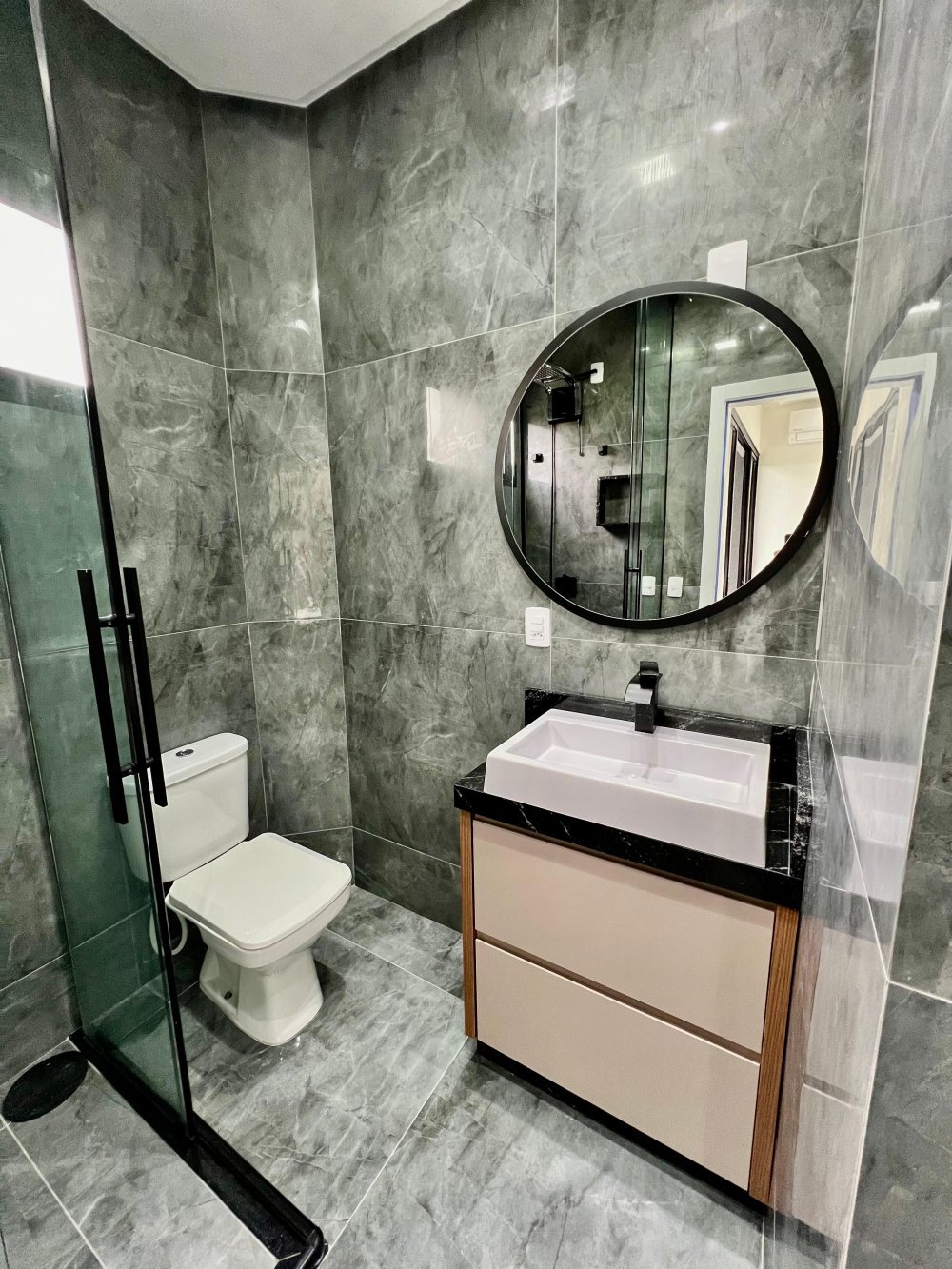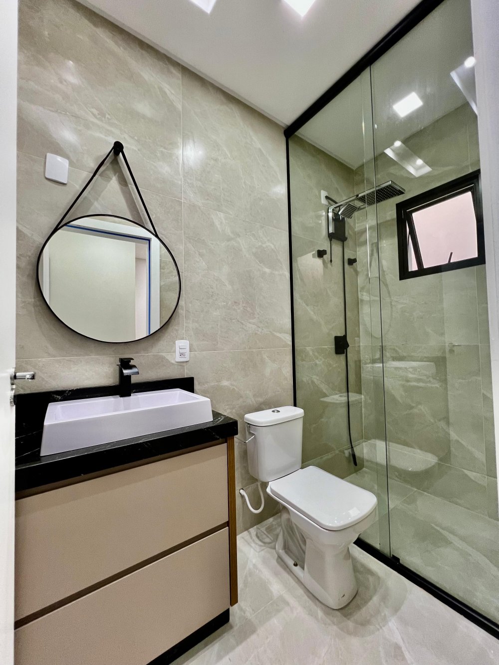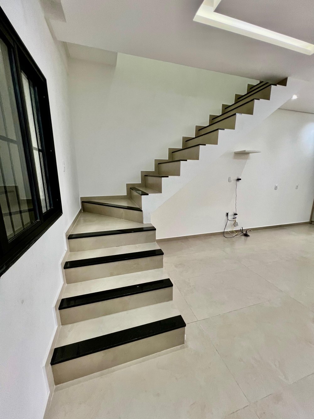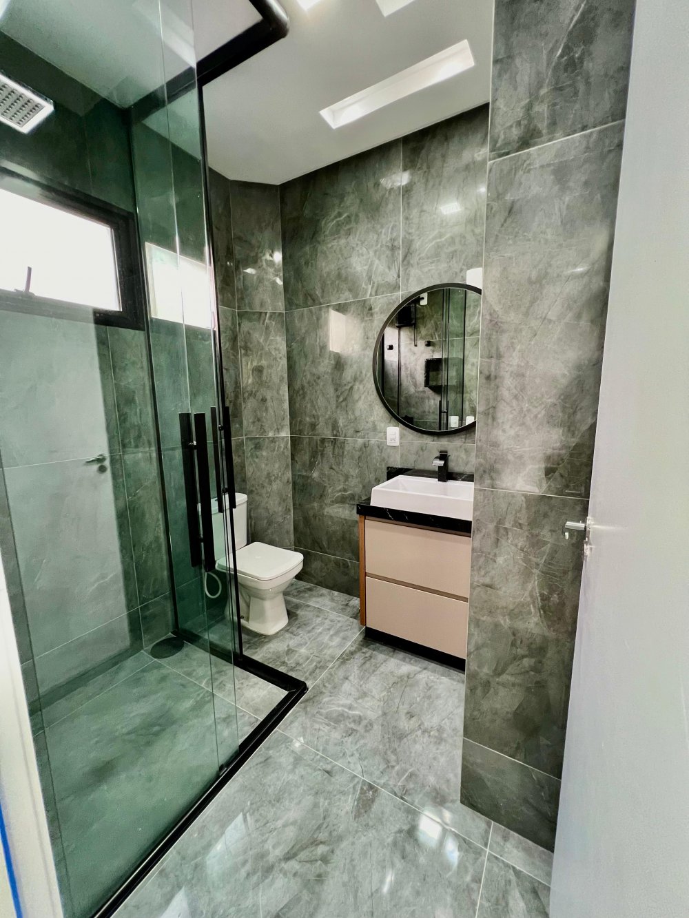 Janelas e portas de vidro com esquadrias em preto;