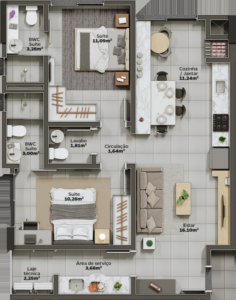 Apartamento 75,78m², sendo: