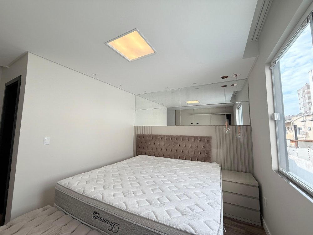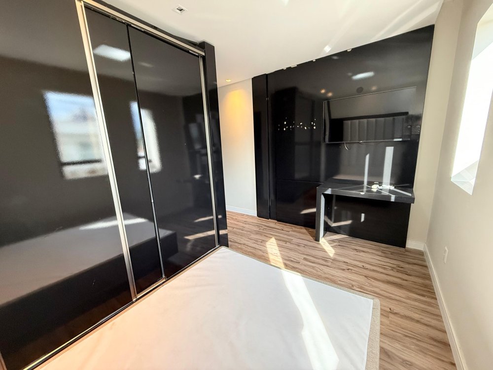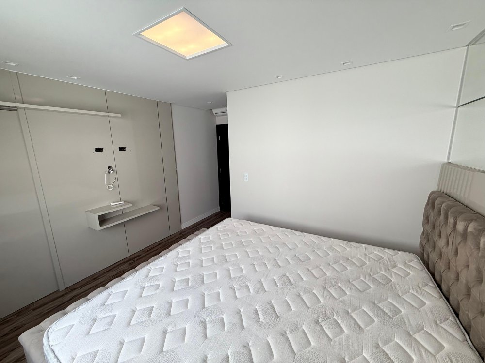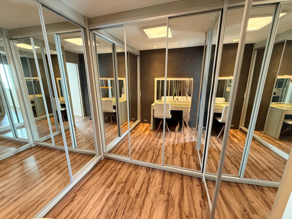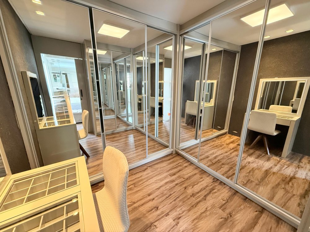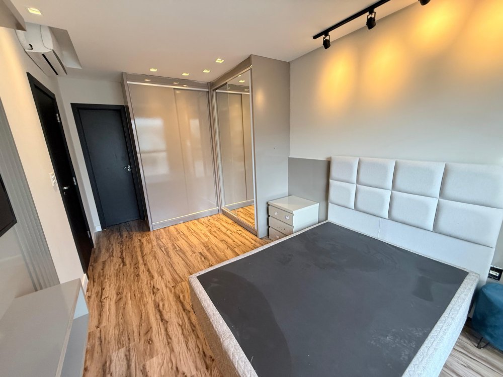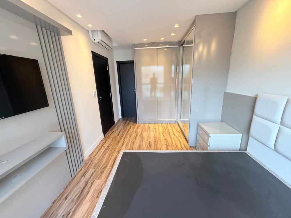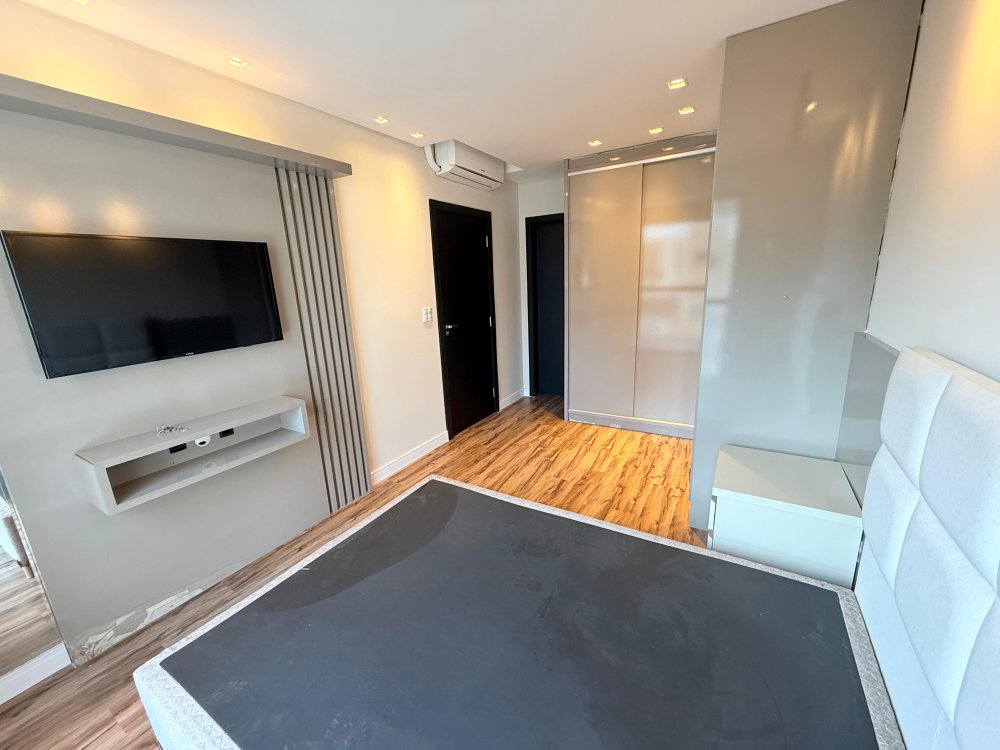 01 Suíte master com cama box, painel de TV, TV, ar condicionado e closet sob medida com penteadeira.