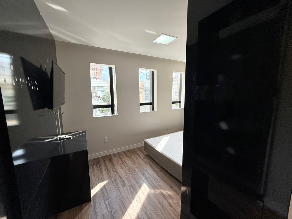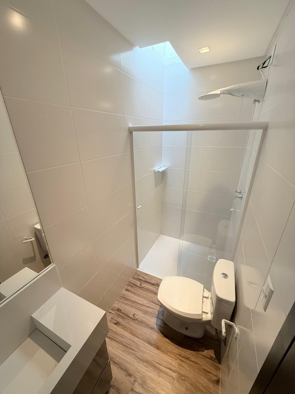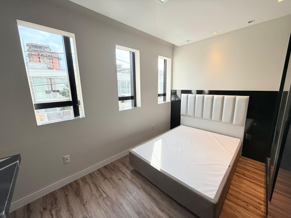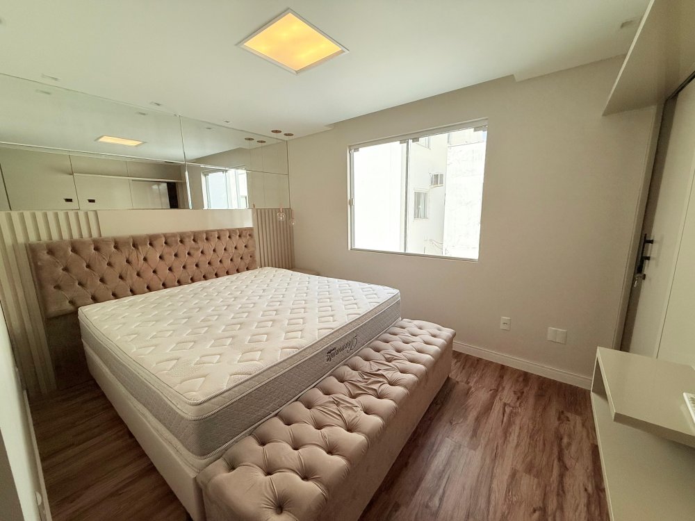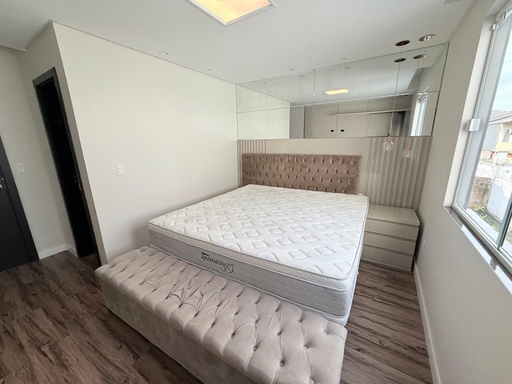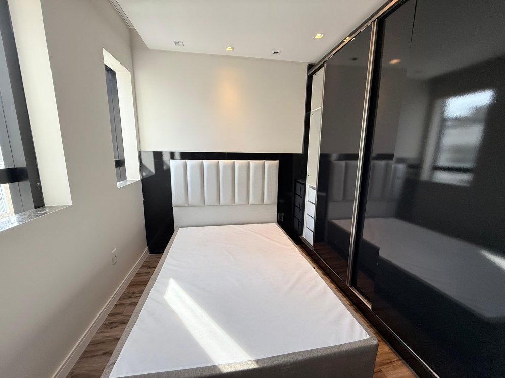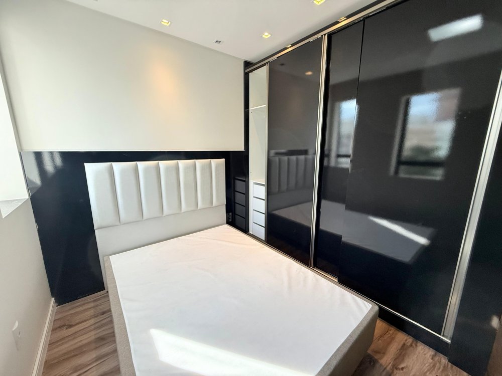01 suíte com guarda roupas sob medida, cabeceira, box de cama, painel de TV, TV e banheiro mobiliado.