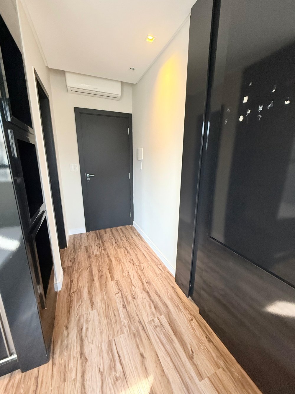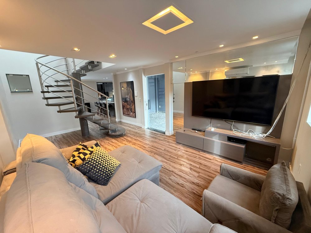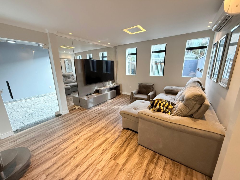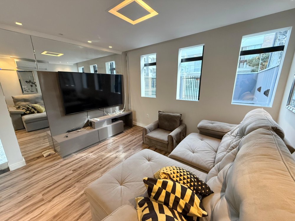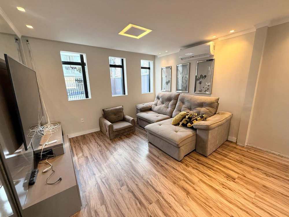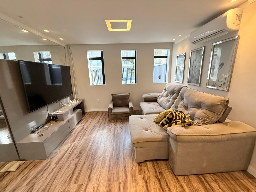01 Sala mobiliada com painel de TV, TV, sofá, ar condicionado.