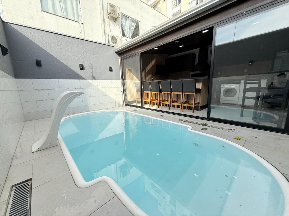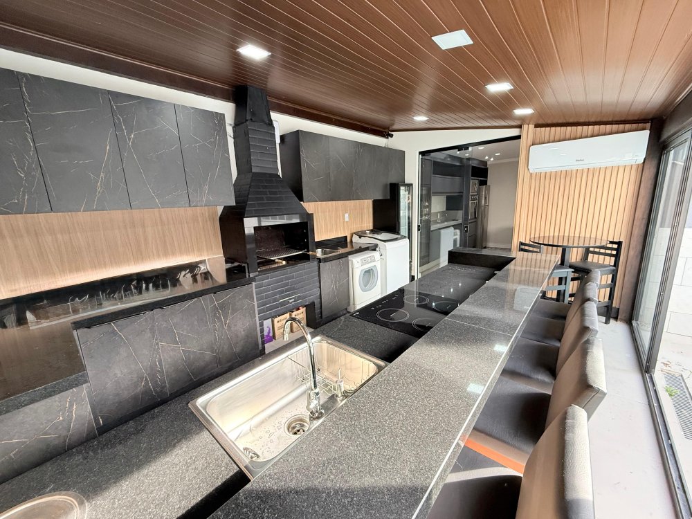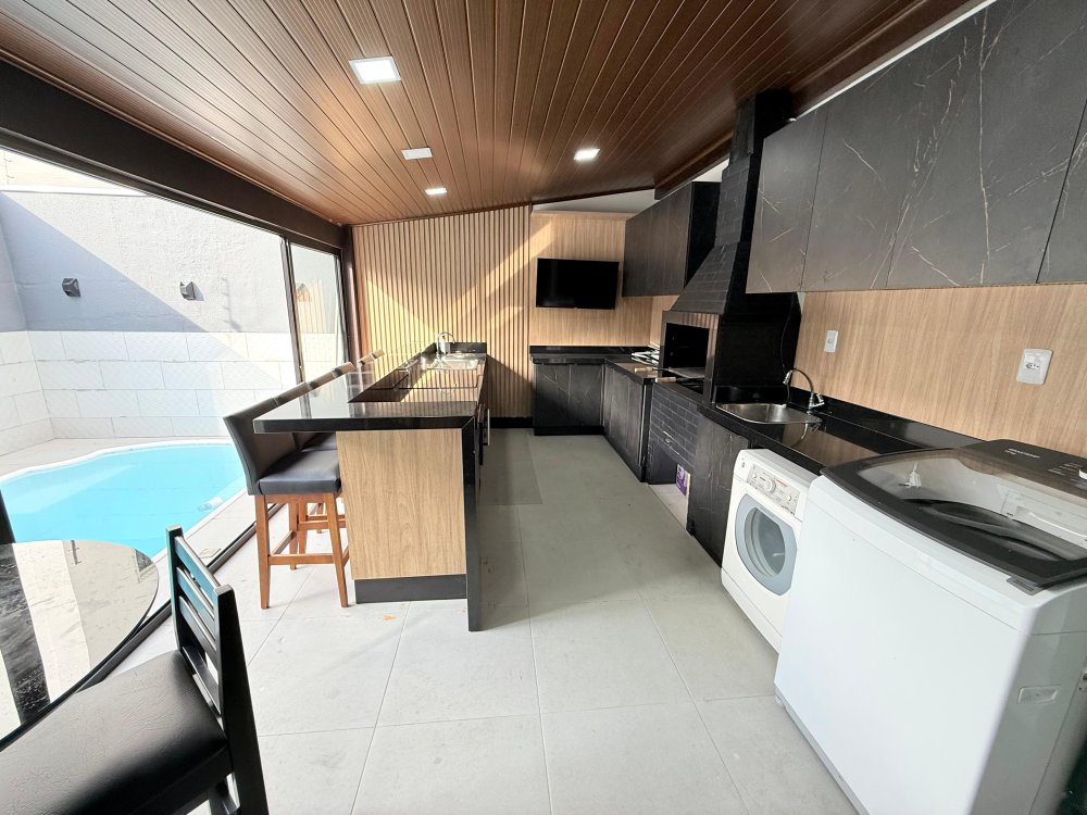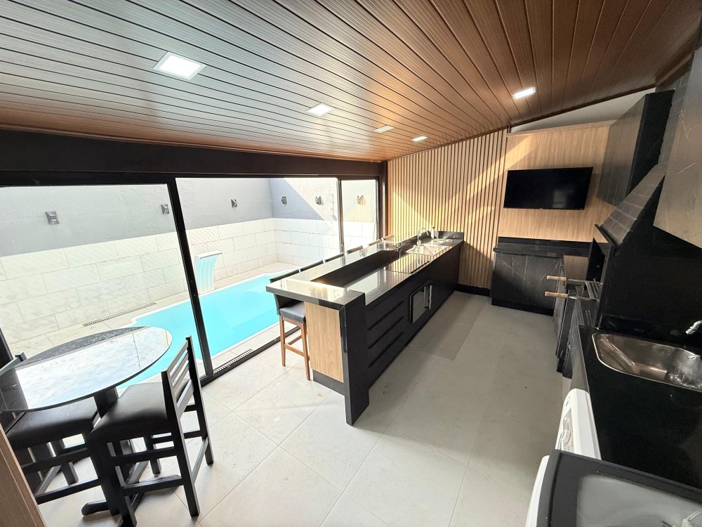 Área gourmet com churrasqueira, fogão, bancada, cadeiras e piscina.