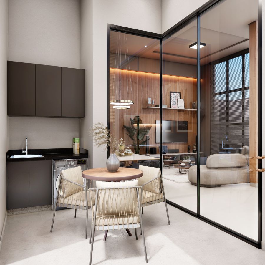 Sala de estar e jantar integradas com a cozinha;