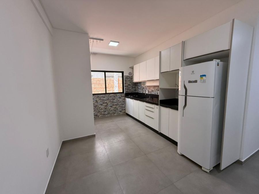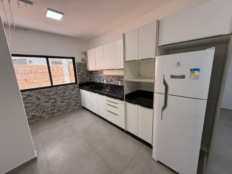 01 cozinha com móveis sob medida, acabamento em pedra mármore, fogão cooktop e geladeira