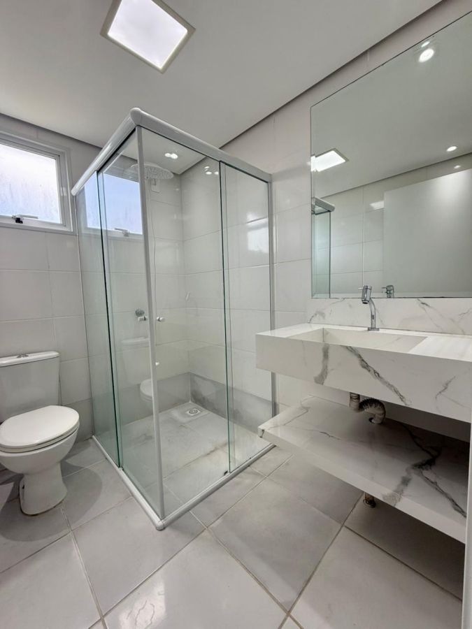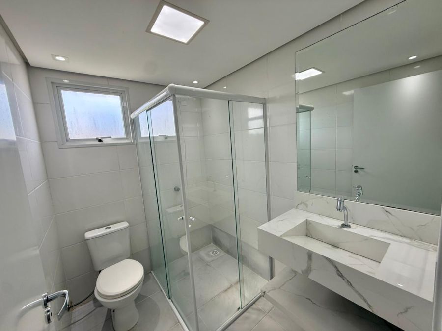 Banheiro com bancada e box de vidro