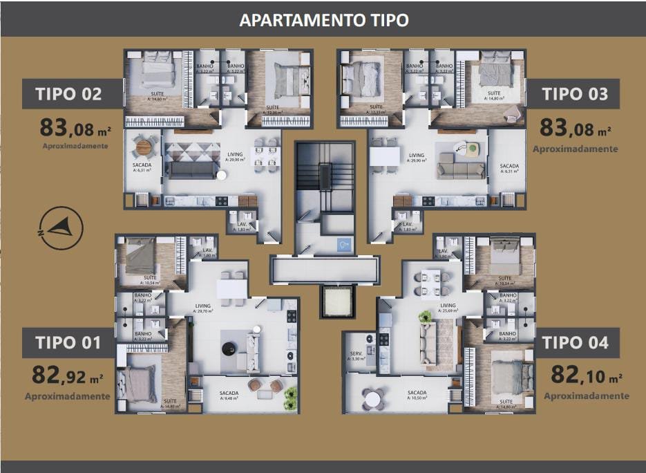 Apartamento com medidas de 82,10m2 até 83,08m², sendo: